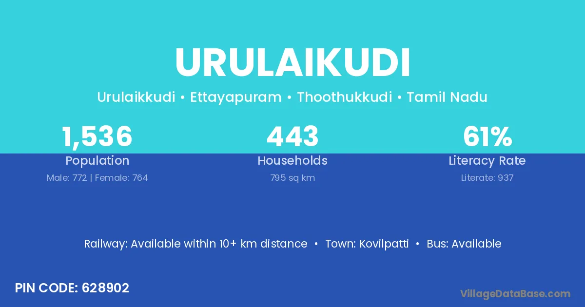 Urulaikudi village has a total population of 1,536 people, of which 772 are males and 764 are females.