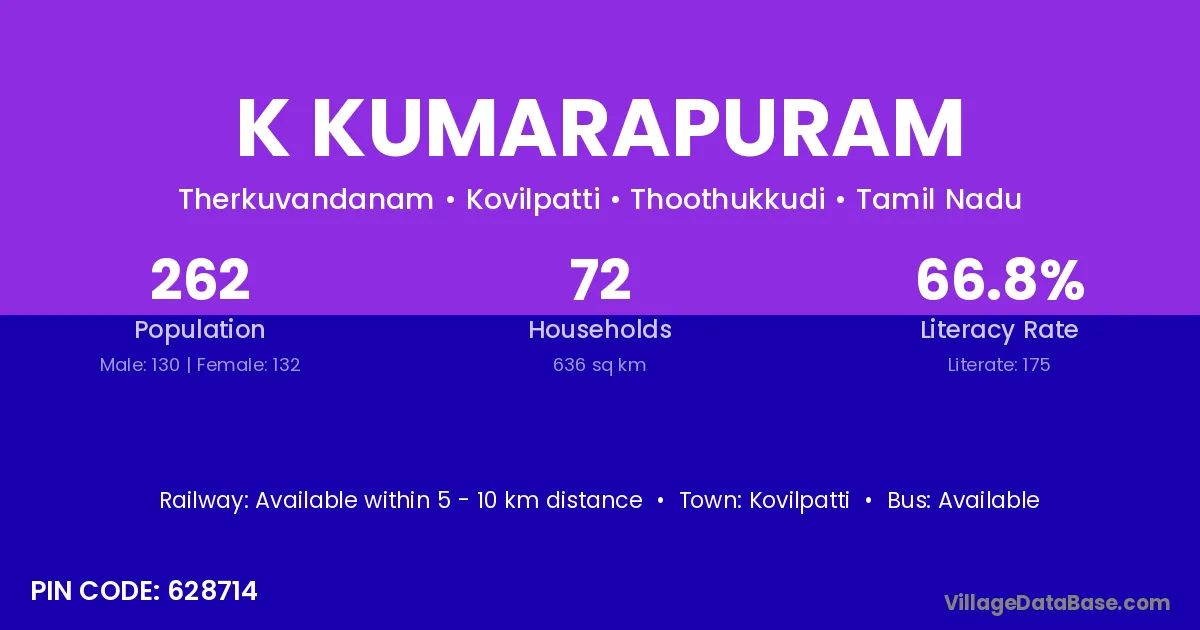 K Kumarapuram village has a total population of 262 people, of which 130 are males and 132 are females.