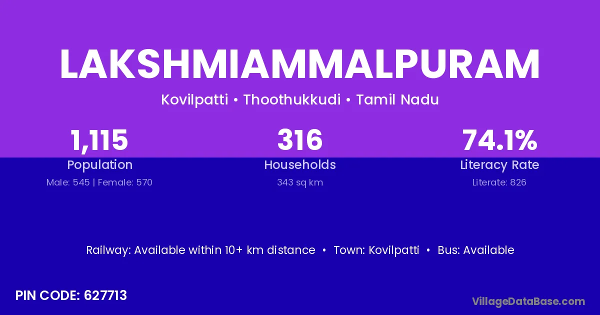 Kovilpatti is the nearest town to Lakshmiammalpuram village for major economic activities