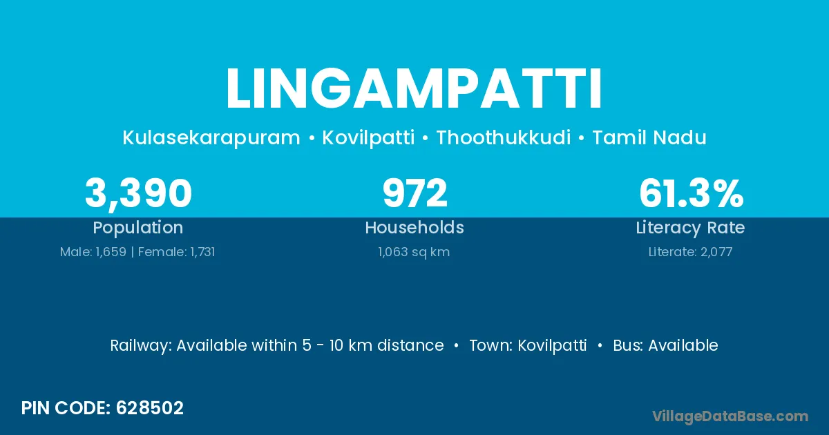 Lingampatti village has a total population of 3,390 people, of which 1,659 are males and 1,731 are females.