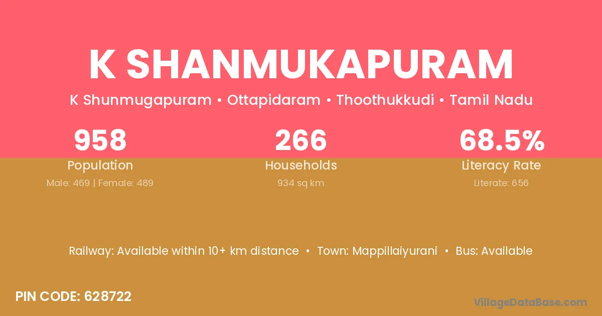K Shanmukapuram village has a total population of 958 people, of which 469 are males and 489 are females.