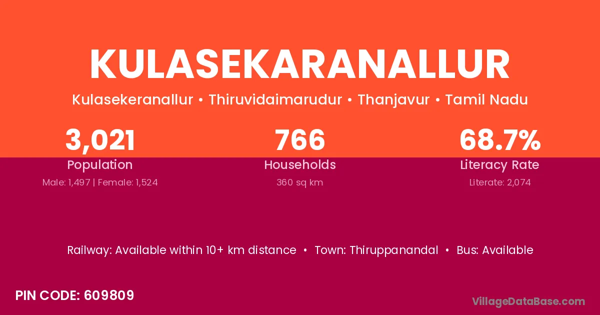 Kulasekaranallur village has a total population of 3,187 people, of which 1,582 are males and 1,605 are females.