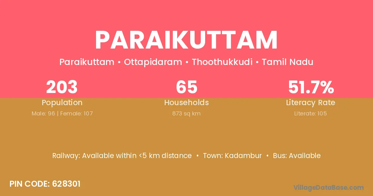 Paraikuttam village has a total population of 203 people, of which 96 are males and 107 are females.