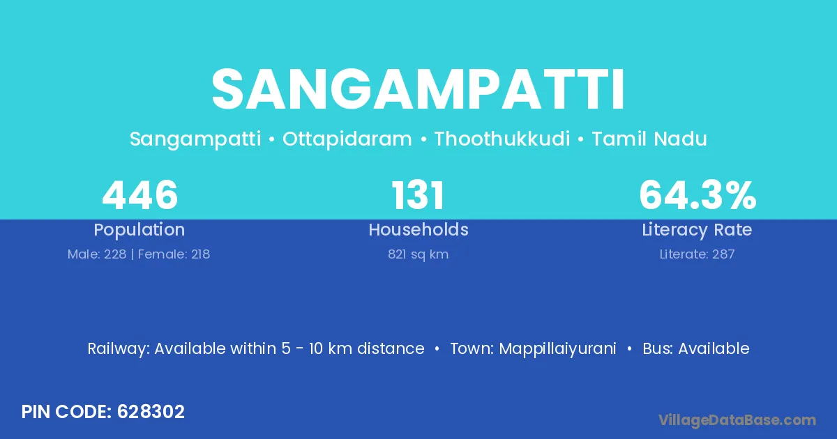 Sangampatti village has a total population of 446 people, of which 228 are males and 218 are females.