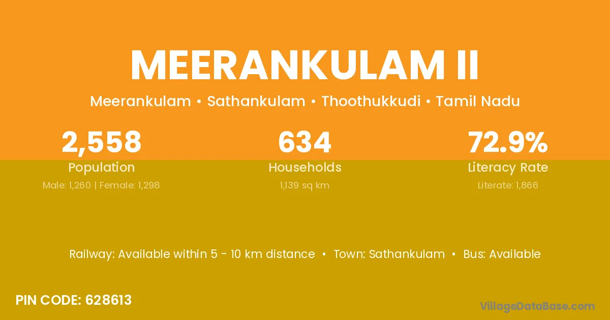 Meerankulam Ii village has a total population of 2,558 people, of which 1,260 are males and 1,298 are females.