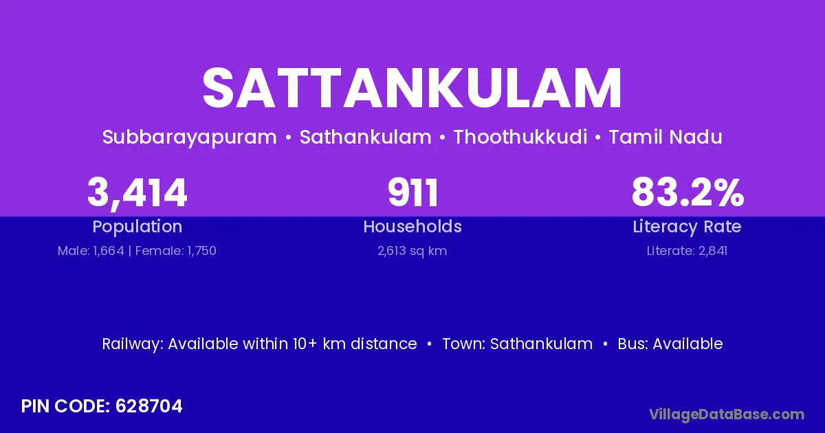 Sattankulam village has a total population of 3,414 people, of which 1,664 are males and 1,750 are females.