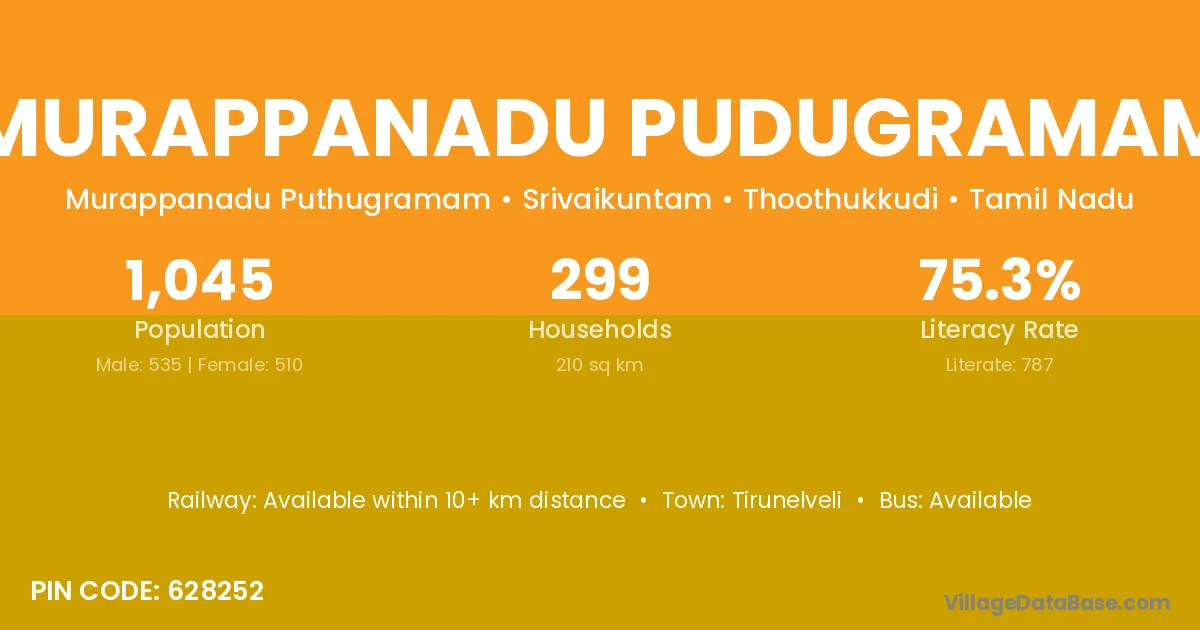 Murappanadu Pudugramam village has a total population of 1,045 people, of which 535 are males and 510 are females.