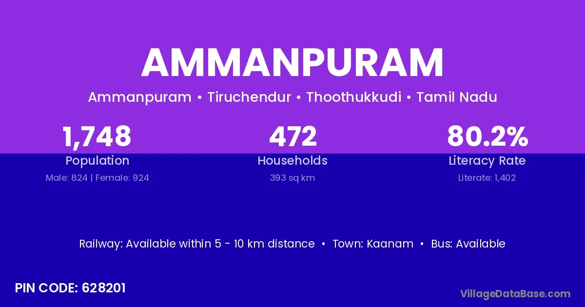 Ammanpuram village has a total population of 1,748 people, of which 824 are males and 924 are females.