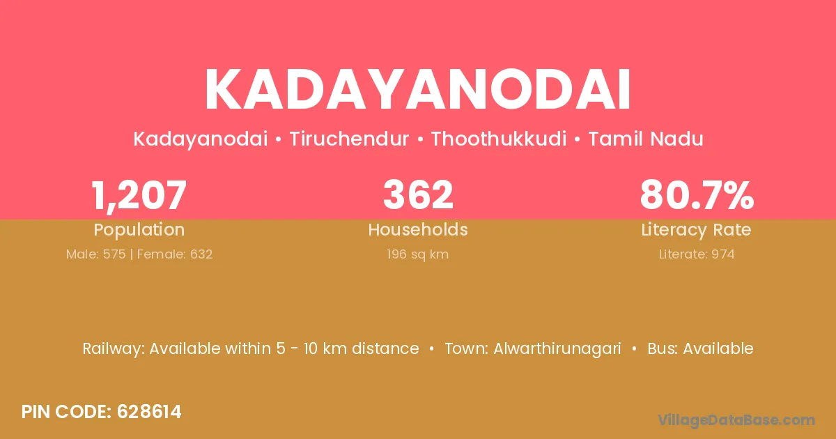 Kadayanodai village has a total population of 1,207 people, of which 575 are males and 632 are females.