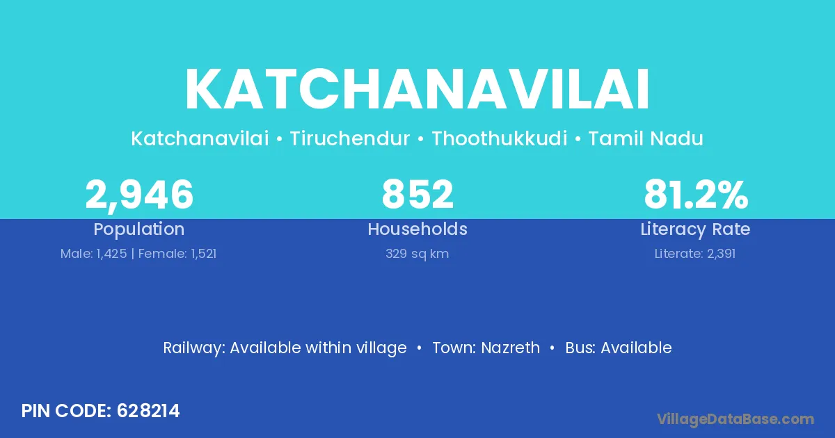 Katchanavilai village has a total population of 2,946 people, of which 1,425 are males and 1,521 are females.