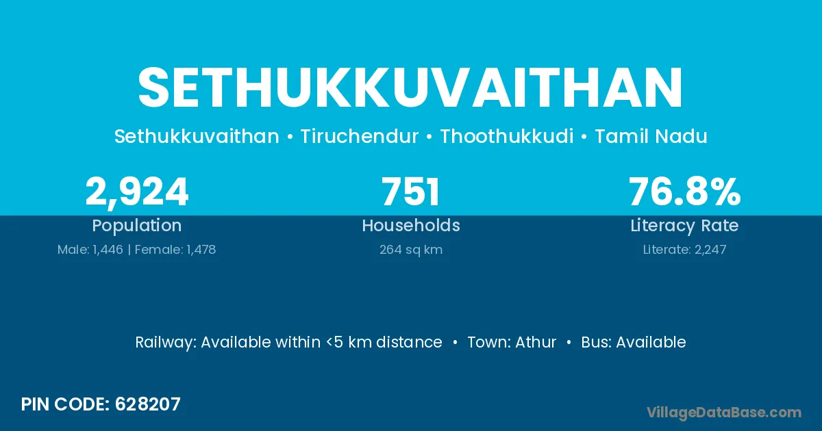 Sethukkuvaithan village has a total population of 2,924 people, of which 1,446 are males and 1,478 are females.