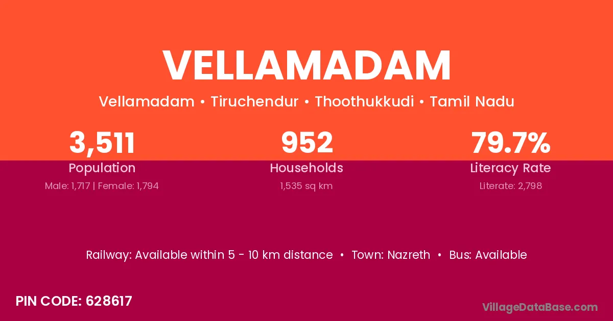 Vellamadam village has a total population of 3,511 people, of which 1,717 are males and 1,794 are females.