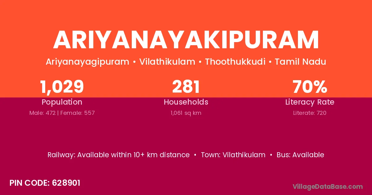 Ariyanayakipuram village has a total population of 1,029 people, of which 472 are males and 557 are females.