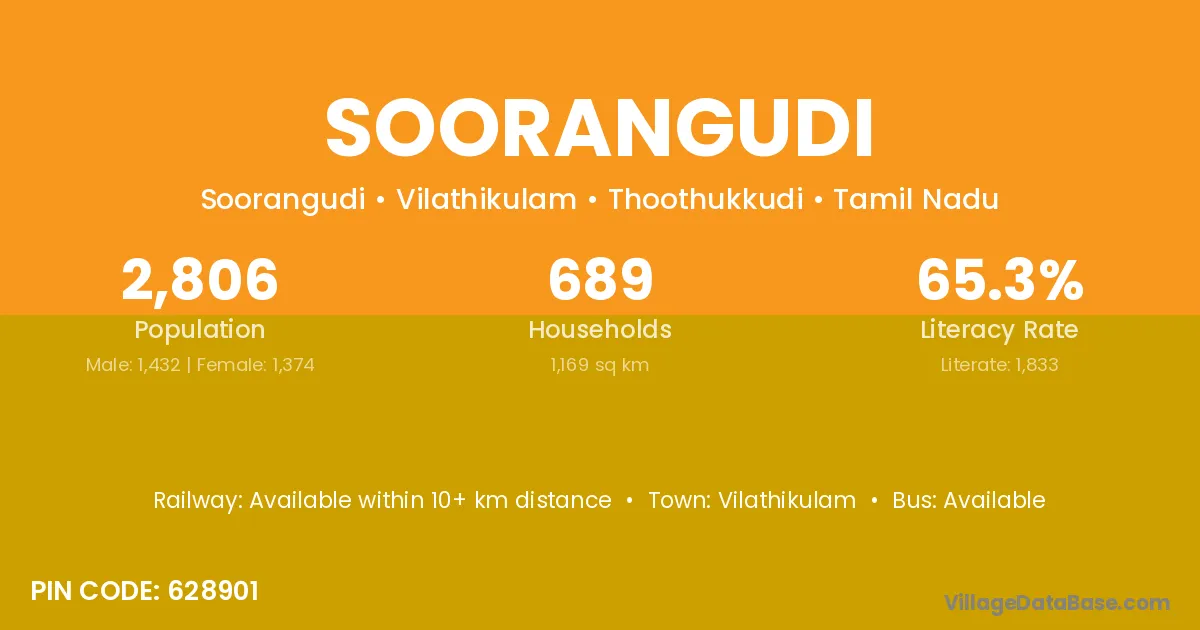 Soorangudi village has a total population of 2,806 people, of which 1,432 are males and 1,374 are females.