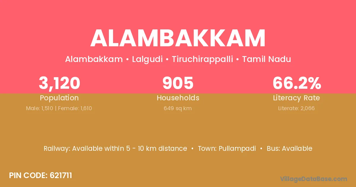 Alambakkam village has a total population of 3,120 people, of which 1,510 are males and 1,610 are females.