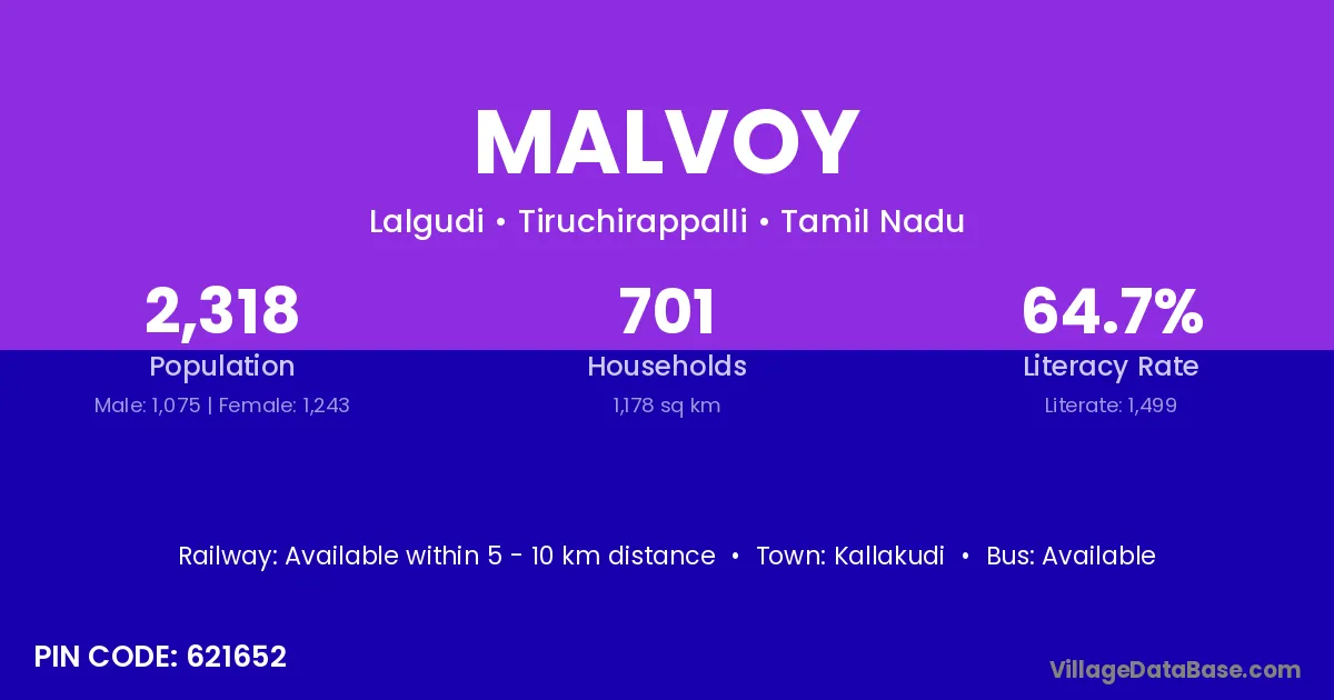 Kallakudi is the nearest town to Malvoy village for major economic activities