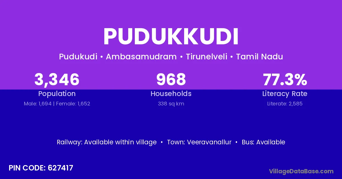 The literacy rate of Pudukkudi village is 78.92%. Male literacy stands at 83.64% and female literacy at 74.53%.