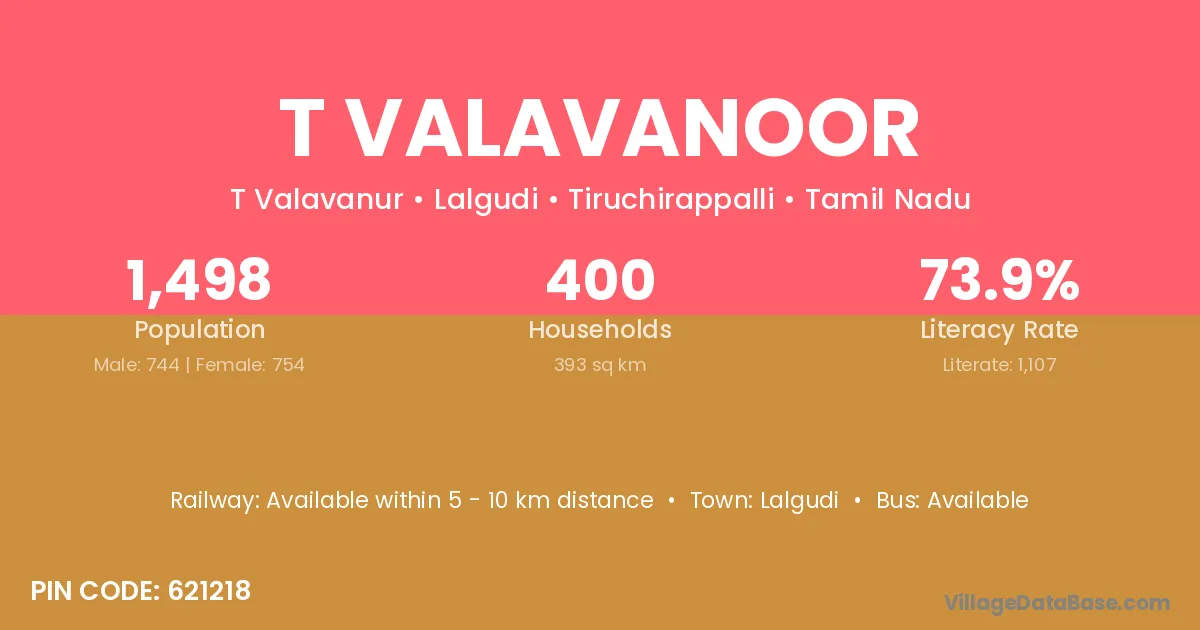 T Valavanoor village has a total population of 1,498 people, of which 744 are males and 754 are females.