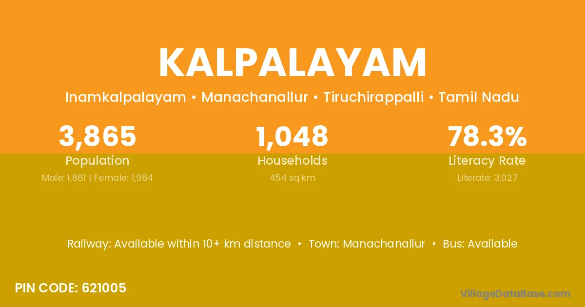 Kalpalayam village has a total population of 3,865 people, of which 1,881 are males and 1,984 are females.
