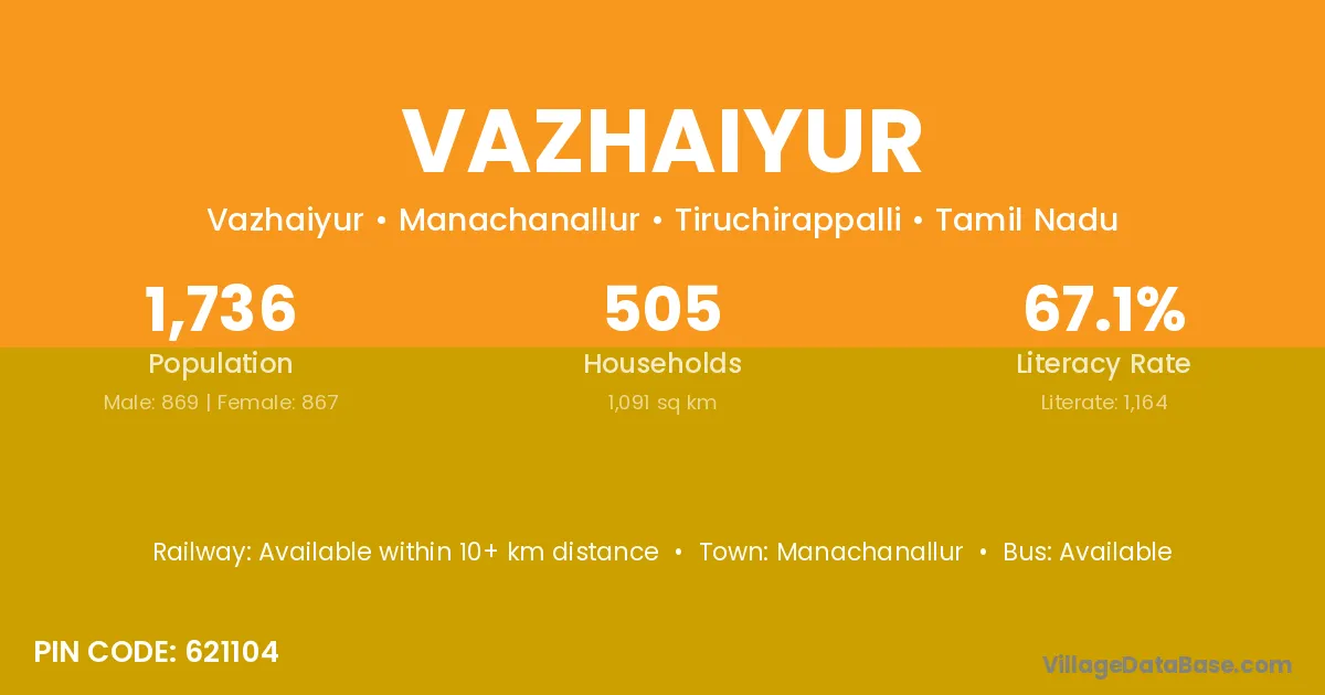 Vazhaiyur village has a total population of 1,736 people, of which 869 are males and 867 are females.