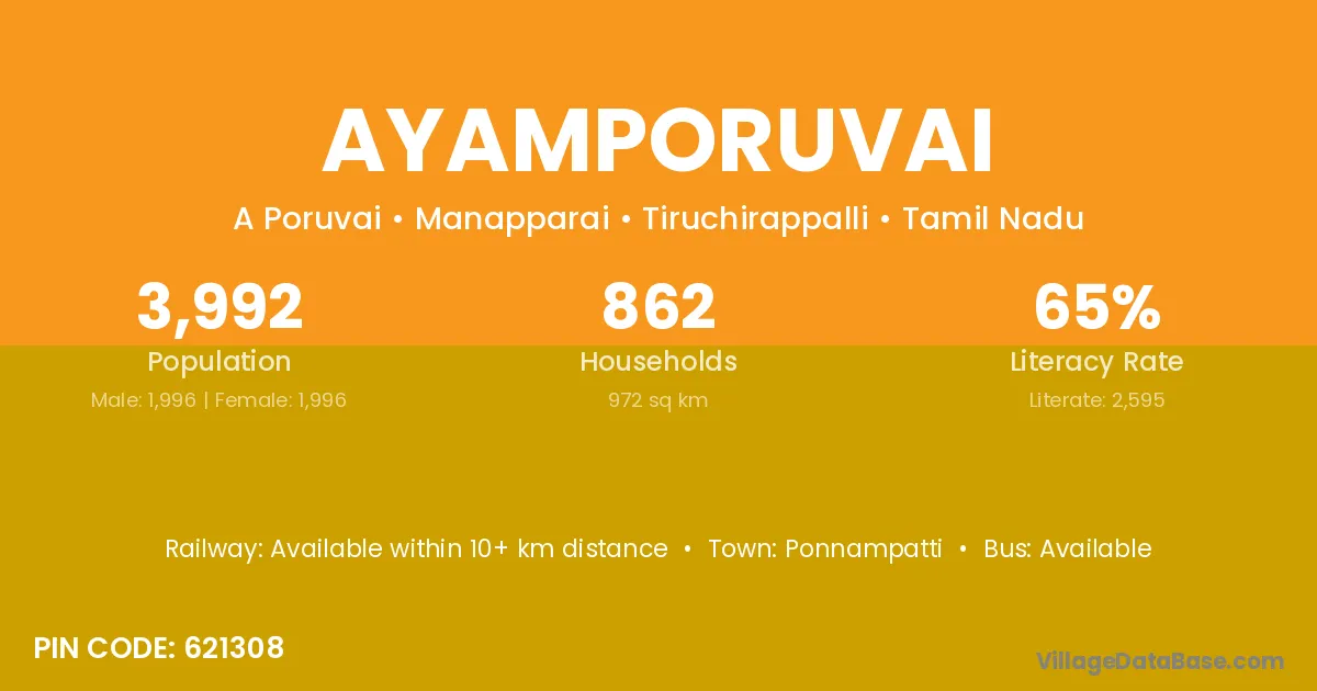 Ayamporuvai village has a total population of 3,992 people, of which 1,996 are males and 1,996 are females.