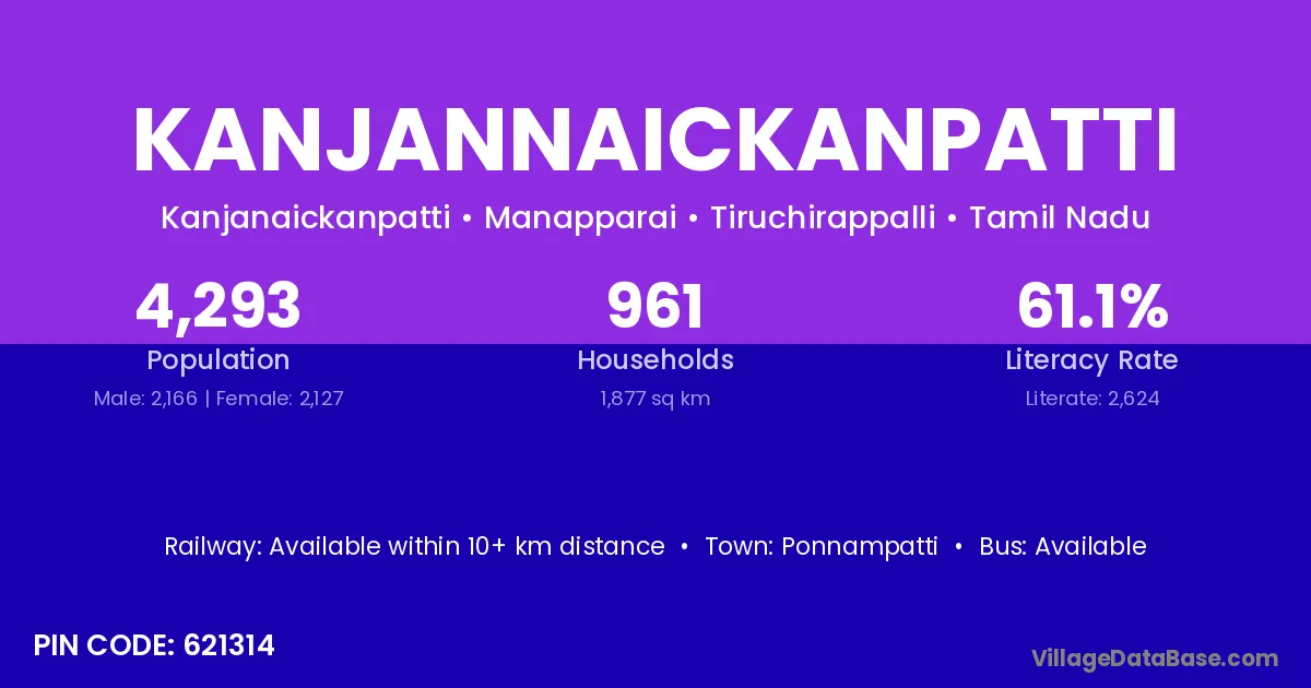 Kanjannaickanpatti village has a total population of 4,293 people, of which 2,166 are males and 2,127 are females.