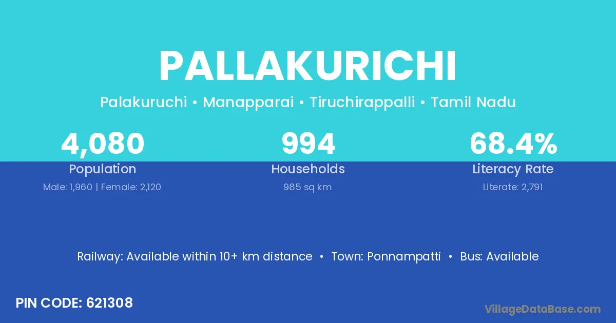 Pallakurichi village has a total population of 4,080 people, of which 1,960 are males and 2,120 are females.