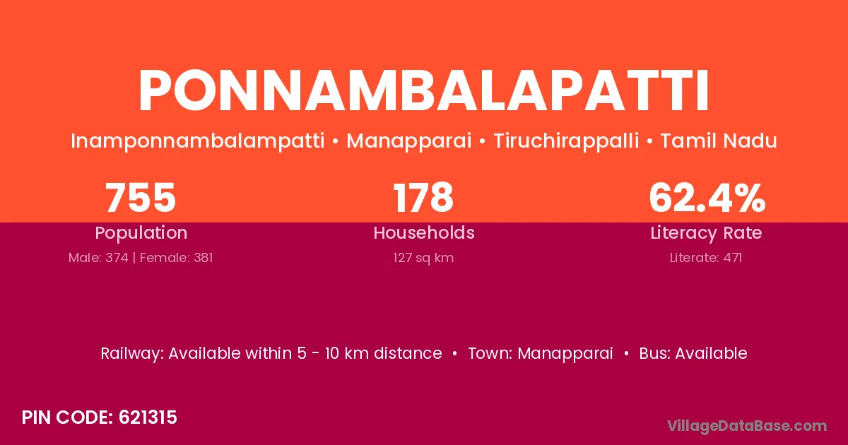 Ponnambalapatti village has a total population of 755 people, of which 374 are males and 381 are females.