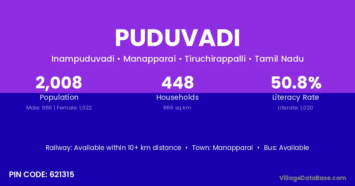 Manapparai is the nearest town to Puduvadi village for major economic activities