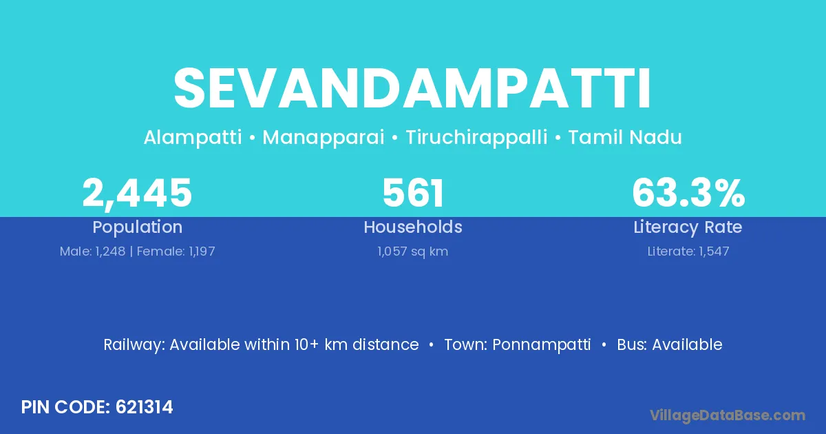 Sevandampatti village has a total population of 2,445 people, of which 1,248 are males and 1,197 are females.