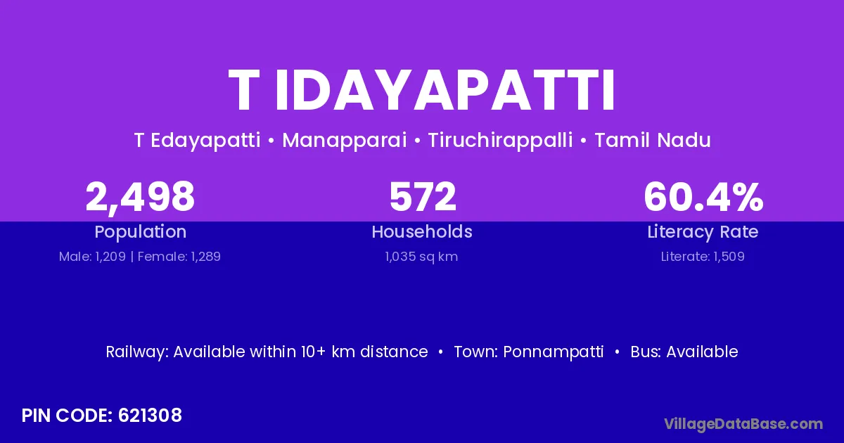 T Idayapatti village has a total population of 2,498 people, of which 1,209 are males and 1,289 are females.