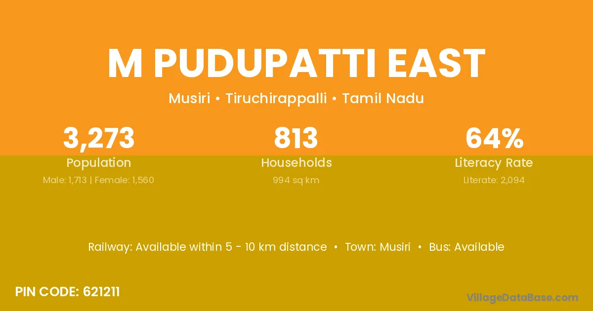 Musiri is the nearest town to M Pudupatti East village for major economic activities