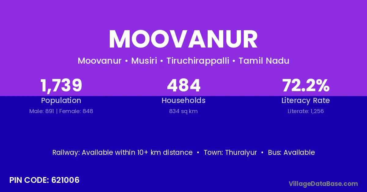 Moovanur village has a total population of 1,739 people, of which 891 are males and 848 are females.