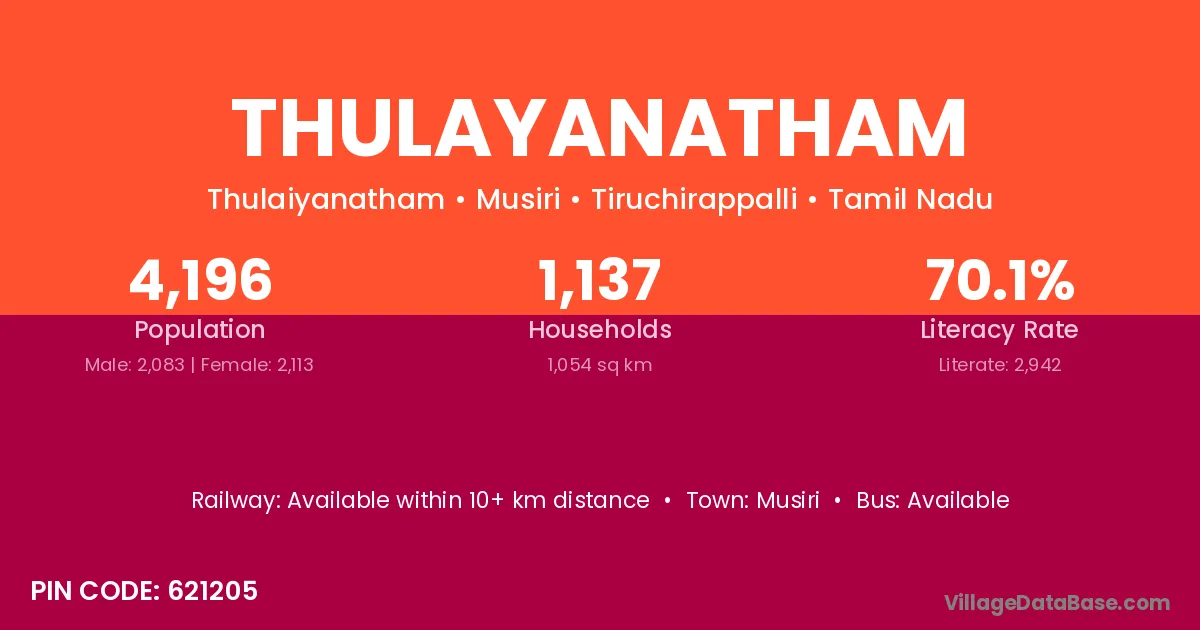 Thulayanatham village has a total population of 4,196 people, of which 2,083 are males and 2,113 are females.