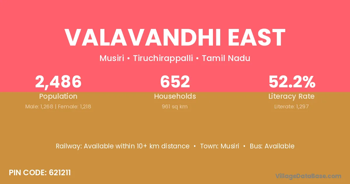 Valavandhi East village has a total population of 2,486 people, of which 1,268 are males and 1,218 are females.