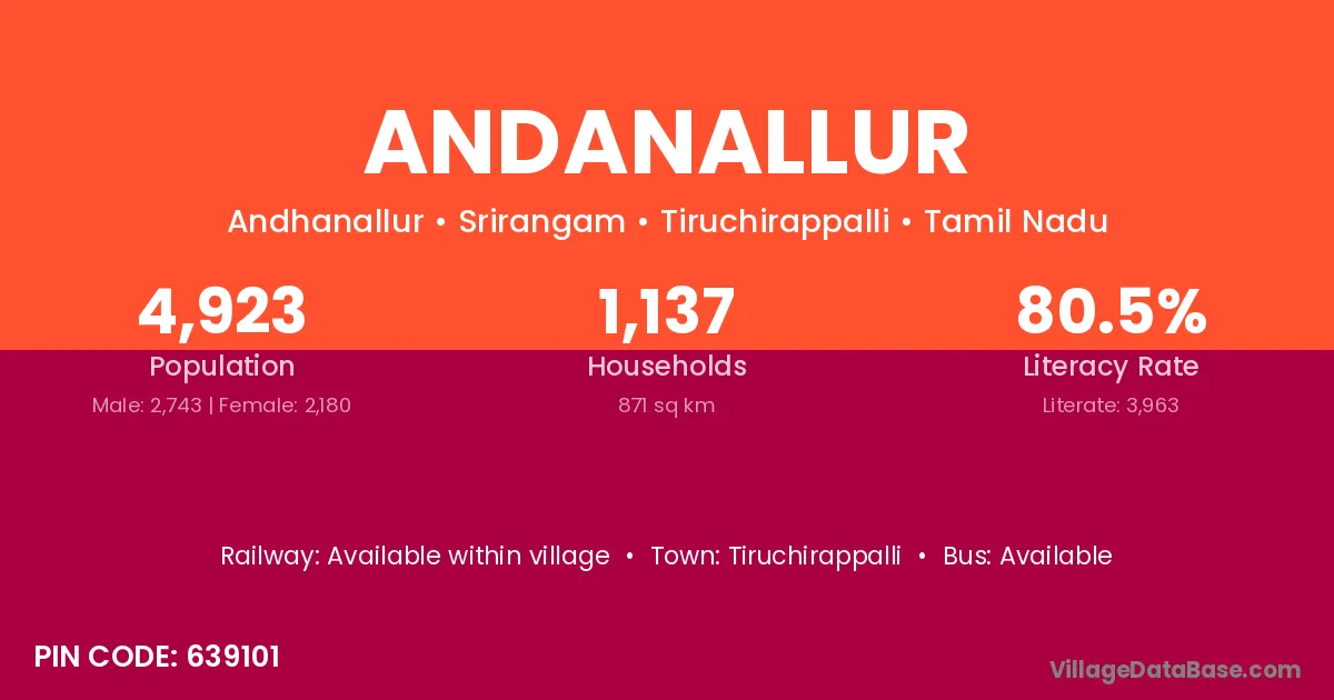 Andanallur village has a total population of 4,923 people, of which 2,743 are males and 2,180 are females.