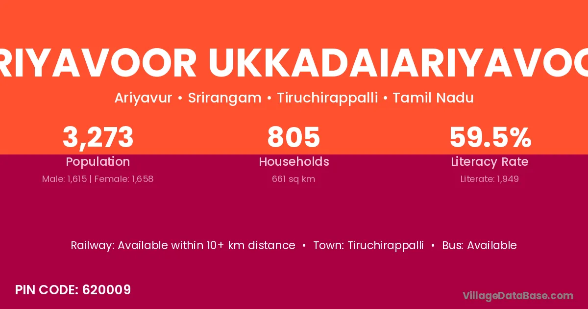 Ariyavoor Ukkadaiariyavoor village has a total population of 3,273 people, of which 1,615 are males and 1,658 are females.