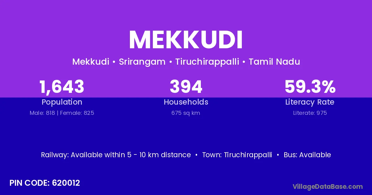 According to Census 2011 information, the village code of Mekkudi village is 620012.