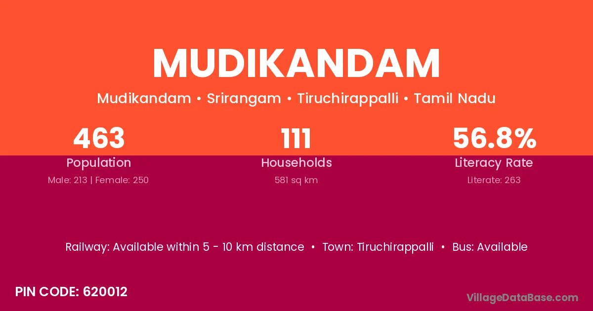 Mudikandam village has a total population of 463 people, of which 213 are males and 250 are females.