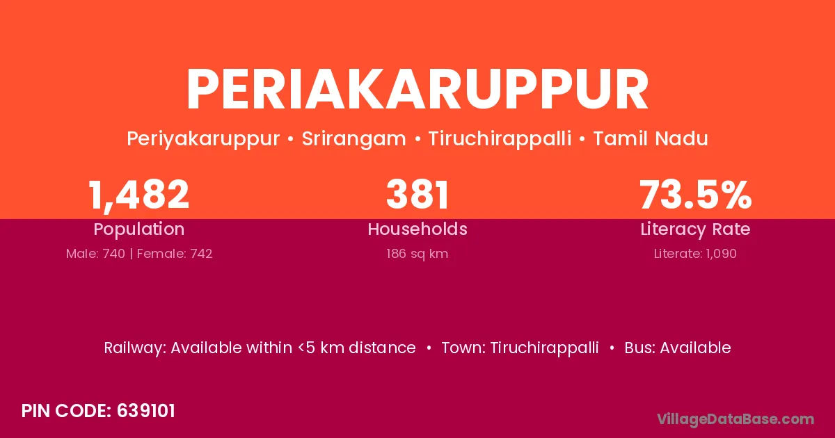 Periakaruppur village has a total population of 1,482 people, of which 740 are males and 742 are females.