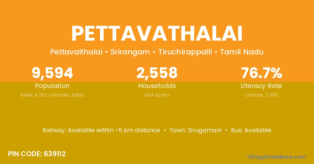 Pettavathalai village has a total population of 9,594 people, of which 4,702 are males and 4,892 are females.