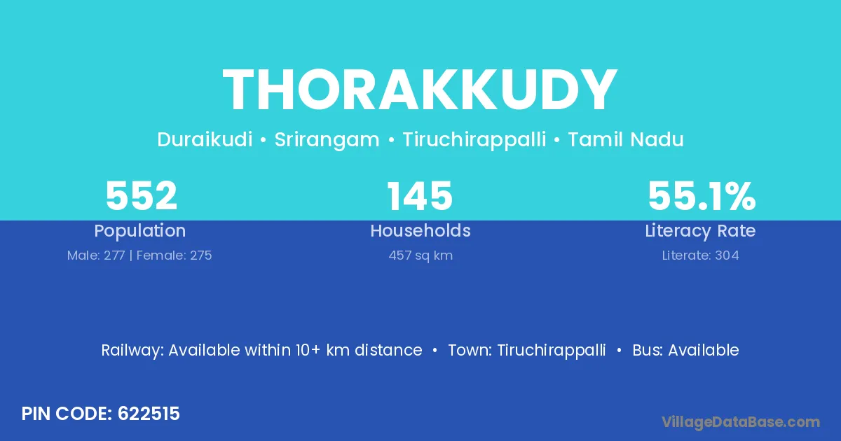 Thorakkudy village has a total population of 552 people, of which 277 are males and 275 are females.