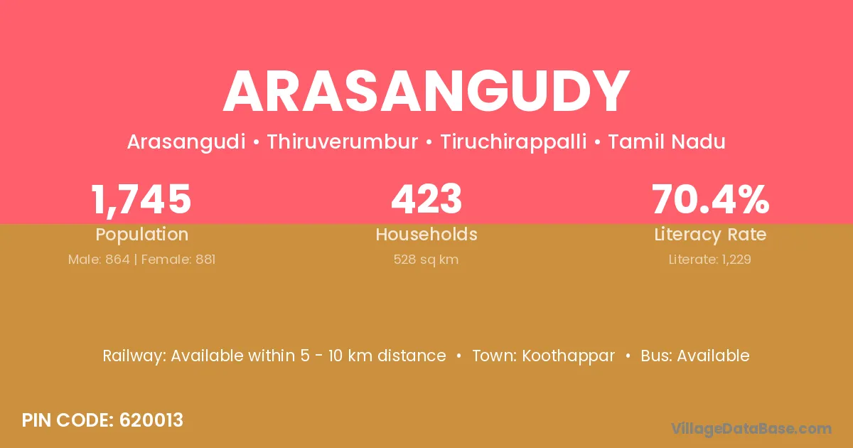 Arasangudy village has a total population of 1,745 people, of which 864 are males and 881 are females.