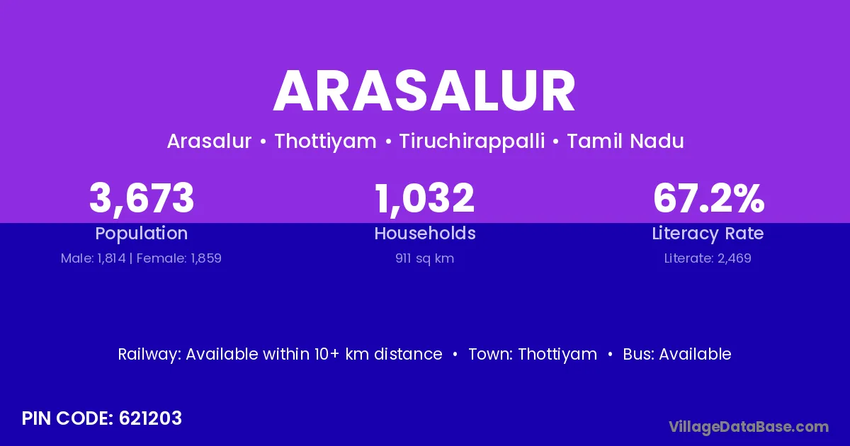 According to Census 2011 information, the village code of Arasalur village is 621203.