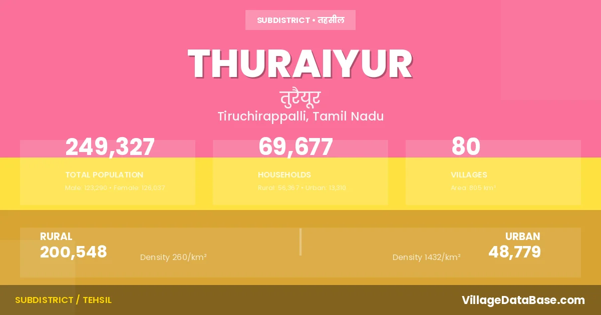 According to the 2011 census The total area of Thuraiyur Taluka is 805 km², with a population of 249327 people. The population density is 310 inhabitants per square kilometre, and there are approximately 69677 houses in the sub district.
