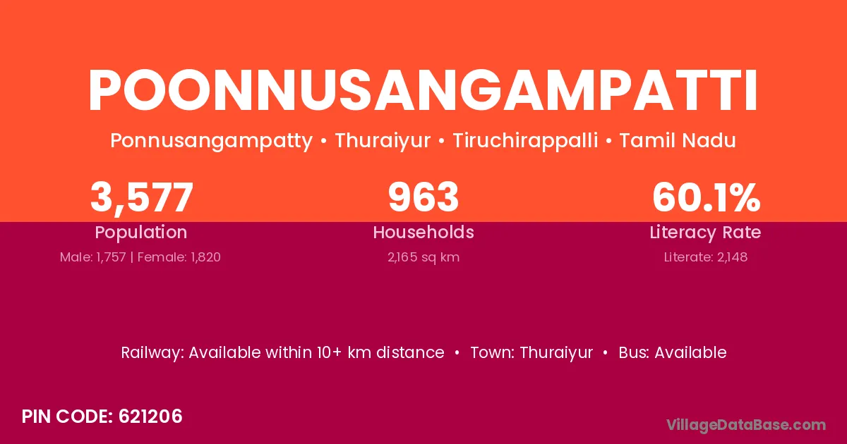 Poonnusangampatti village has a total population of 3,577 people, of which 1,757 are males and 1,820 are females.