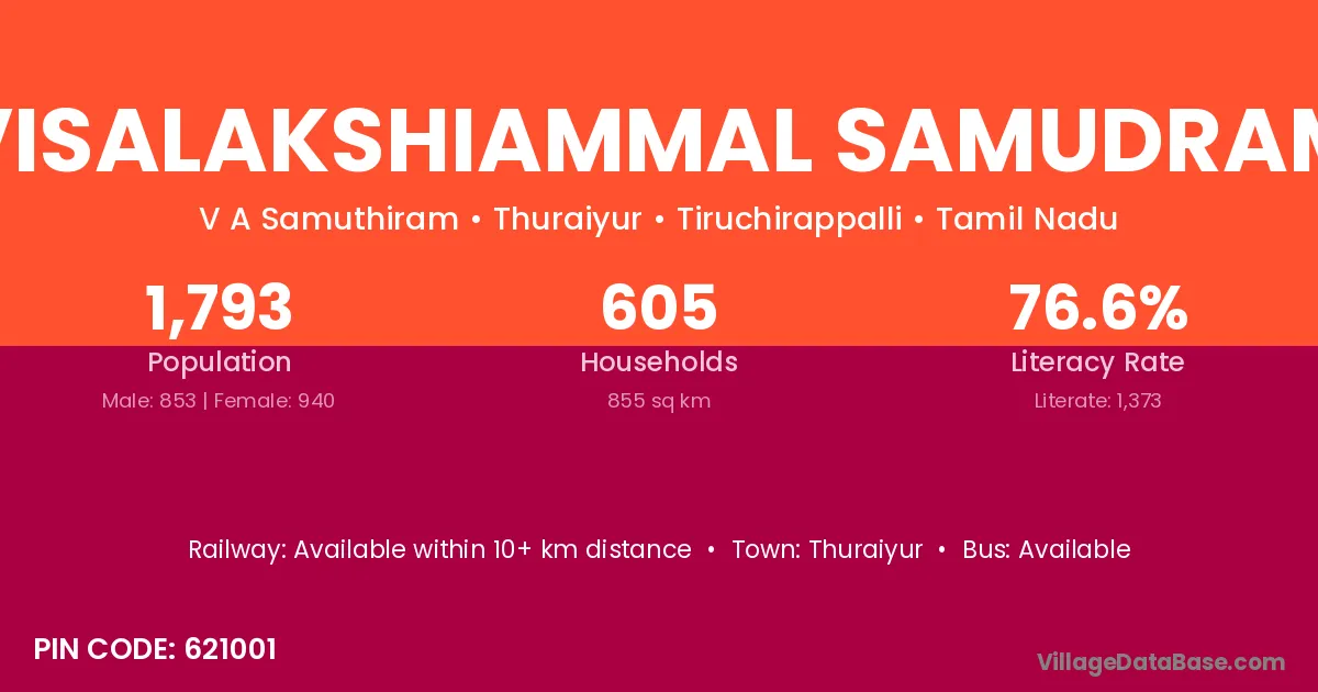 Visalakshiammal Samudram village has a total population of 1,793 people, of which 853 are males and 940 are females.