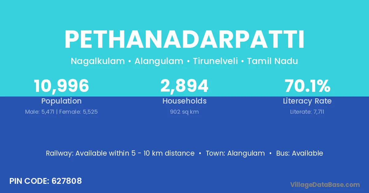 Alangulam is the nearest town to Pethanadarpatti village for major economic activities