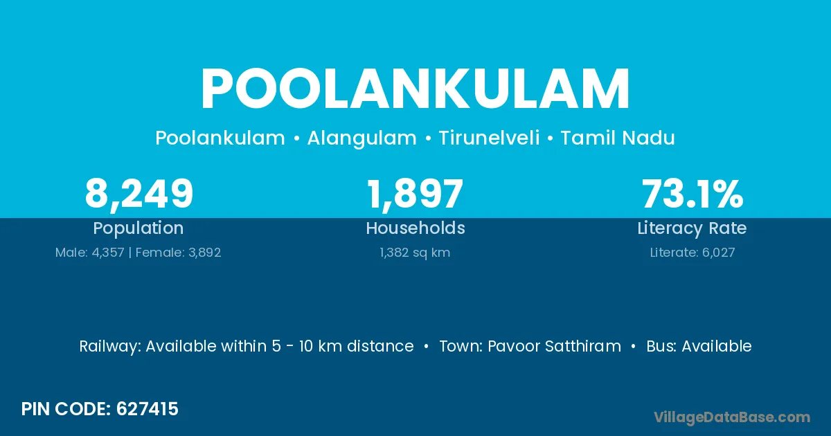 Poolankulam village has a total population of 8,249 people, of which 4,357 are males and 3,892 are females.