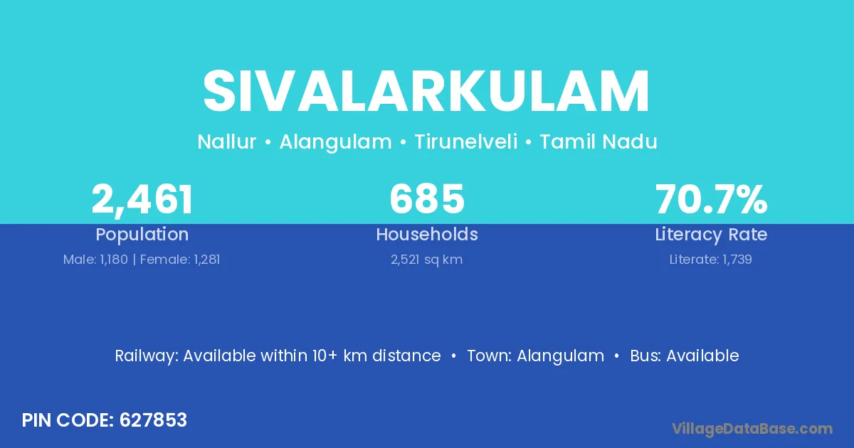 Sivalarkulam village has a total population of 2,461 people, of which 1,180 are males and 1,281 are females.